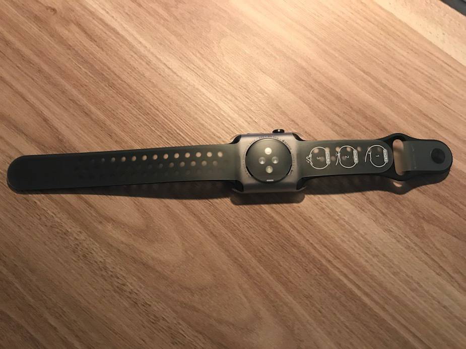 Apple Watch w wersji Nike+ charakteryzuje się czarnym pudełkiem, specjalną wersją silikonowego paska z dziurkami oraz logiem Nike z dodatkowym plusem na spodzie koperty zegarka, na pasku oraz na pudełku.