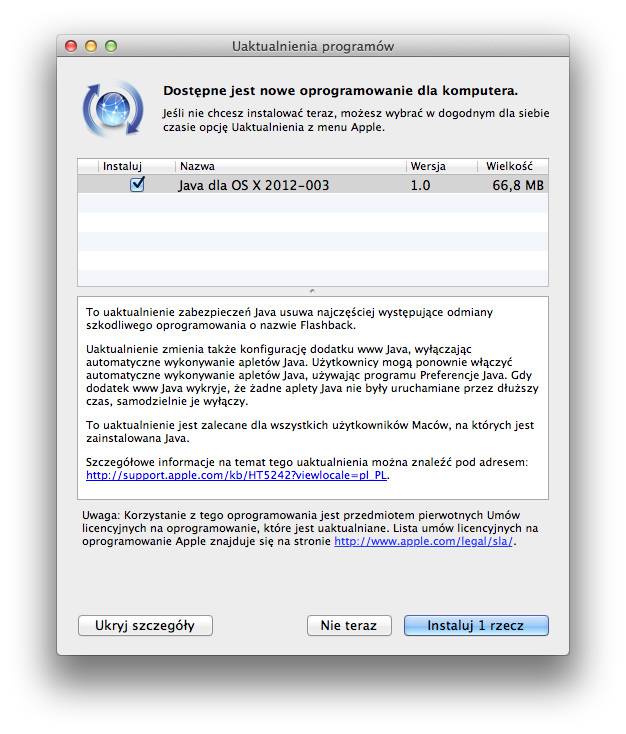 Aktualizacja zalecana jest dla wszystkich użytkowników systemu OS X Lion, na których zainstalowana jest Java. Łatka aktualizuje środowisko do wersji 1.6.0_31 i zajmuje 66,8 MB. Tym razem mamy do czynienia z uaktualnieniem zabezpieczeń Java, które usuwa najczęściej występujące odmiany szkodliwego oprogramowania o nazwie Flashback.