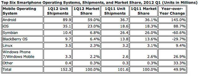 Dominacja tylko dwóch platform na rynku smartfonów jest coraz bardziej wyraźna. Ostatnie wyniki pokazują jak niewiele do powiedzenia ma konkurencja, która wciąż zostaje daleko w tyle. Na 152 miliony smartfonów, które weszły do obiegu w pierwszym kwartale 2012 roku, prawie 90 mln stanowiły te z Androidem, a nieco ponad 35 mln te z iOS. Podium zamyka Symbian, który pojawił się na niewiele ponad 10 mln komórek.