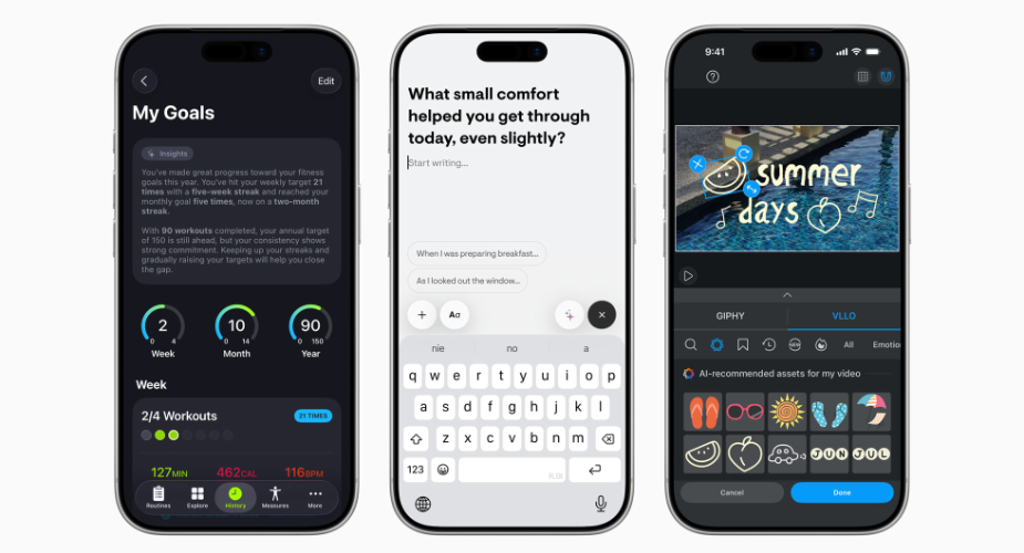 Aplikacja Train Fitness również czerpie z potencjału Foundation Models firmy Apple i sugeruje użytkownikowi kolejne ćwiczenia, kiedy potrzebny mu sprzęt jest akurat niedostępny. Użytkownicy mogą tu również udoskonalać swoje treningi, wprowadzając szczegółowe instrukcje, na przykład preferowane ćwiczenia czy partie mięśni do pominięcia. Motivation przesyła motywujące przypomnienia i porządkuje ulubione treści użytkownika według emocji i tematów, a aplikacja Streaks sprytnie sugeruje i automatycznie klasyfikuje czynności na liście zadań do zrobienia. Dzięki aplikacji Wakeout! użytkownicy będą mogli zrobić sobie spersonalizowane przerwy na ruch, a wybrane przez użytkownika ćwiczenie zostanie dokładnie umotywowane. Bazując na możliwych do wygenerowania strukturach, model bazowy dokonuje selekcji spośród tysięcy dostępnych nagrań i opracowuje dopasowany dla każdego użytkownika schemat działania.