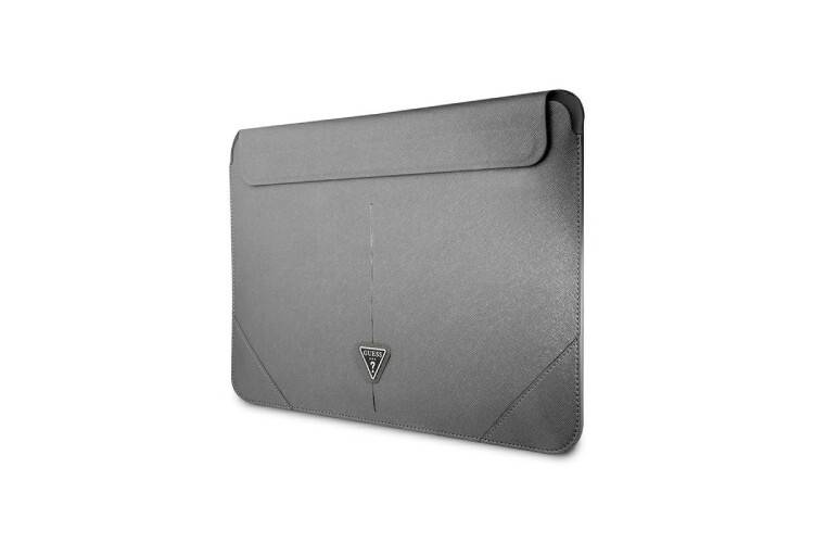Guess Saffiano Triangle Logo Sleeve etui na notebooka o przekątnej do 16 cali. Wykonane z przyjemnej w dotyku fakturze ze skóry ekologicznej saffiano i ozdobione trójkątnym logo Guess. Magnetyczne zamknięcie zapobiega przypadkowemu wysunięciu się laptopa z głównej kieszeni, która jest wyściełana delikatnym materiałem chroniącym przed uszkodzeniem.