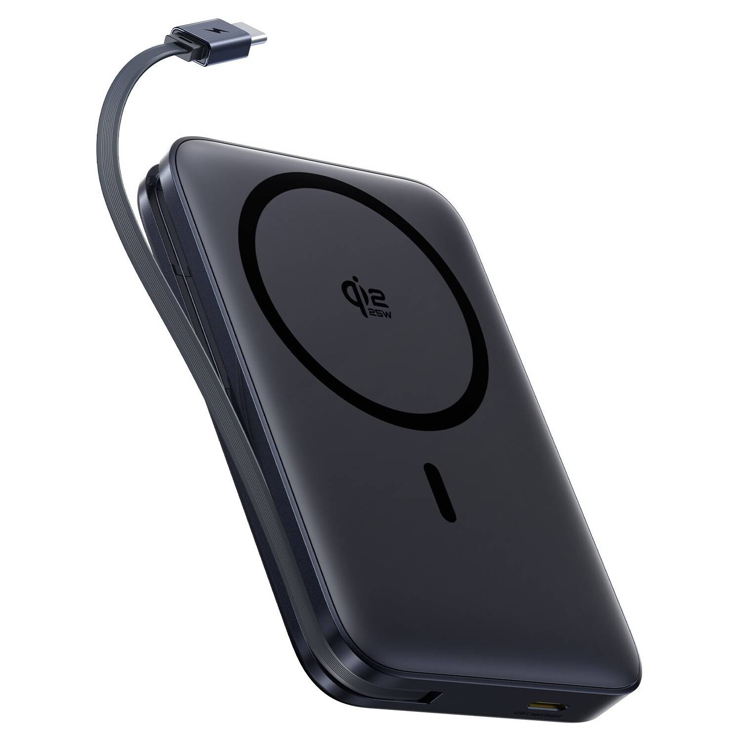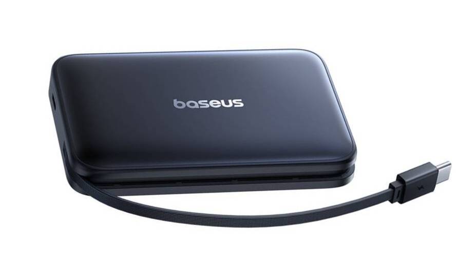 Poza gniazdem USB-C posiada on także krótki kabel USB-C, chowany w specjalnej rynience na bocznej krawędzi. Można za jego pomocą ładować zarówno sam powerbank, jak i inne urządzenia. Na jednym z przeciwległych dłuższych boków umieszczono klasyczny wskaźnik naładowania złożony z czterech diod LED oraz pojedynczą diodę LED sygnalizującą pracę urządzenia.