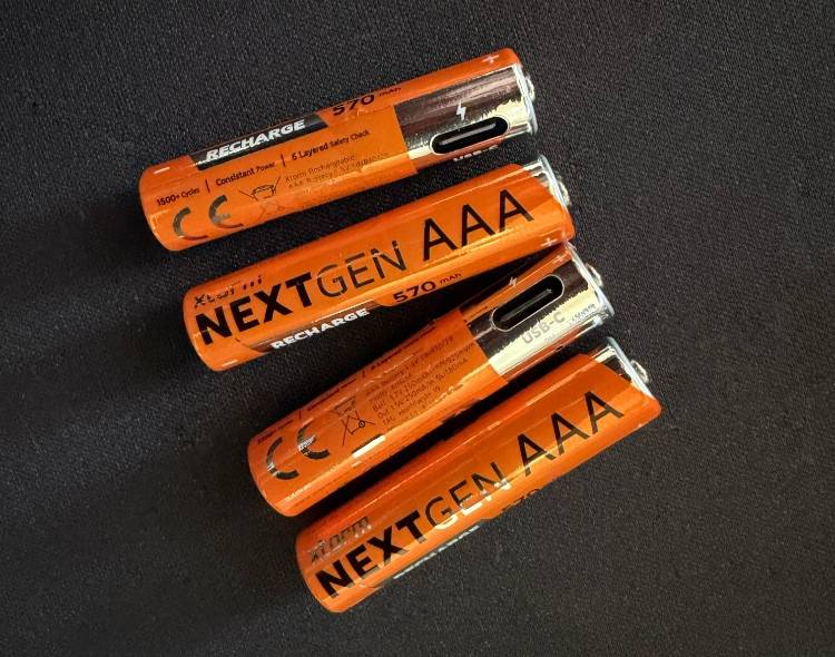 Zestaw zawiera cztery akumulatorki-powerbanki w rozmiarze AAA oraz przewód USB-C, który pozwala na jednoczesne ładowanie wszystkich czterech sztuk. Każdy z nich wygląda jak zwyczajna bateria lub tradycyjny akumulatorek AAA, ale zdradza go umieszczone blisko bieguna dodatniego gniazdo USB-C. Ze względu na swoją formę trafiły do pilota zdalnego sterowania do telewizora oraz do kieszonkowego aparatu cyfrowego — sprzętu już wiekowego, ale wciąż w naszym domu używanego.