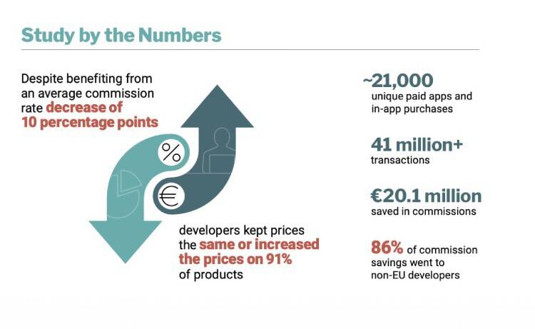 Według badań przeprowadzonych na zlecenie Apple przez Analysis Group, obejmujących 41 milionów transakcji powiązanych z ponad 20 tysiącami aplikacji, pomimo obniżenia prowizji 91% deweloperów nie obniżyło cen lub wręcz je podniosło. W przypadku pozostałych obniżki były zaś niewielkie i, jak twierdzą analitycy, najprawdopodobniej nie związane bezpośrednio z działaniami UE, lecz wynikające z innych czynników rynkowych. W praktyce oznacza to więc, że wprowadzenie przez Apple zmian wymuszonych przez akt o rynkach cyfrowych przyczyniło się do zwiększenia zarobków deweloperów (w większości tych spoza UE, na co zwracają uwagę autorzy raportu), lecz nie przełożyło się na korzyści finansowe dla klientów.