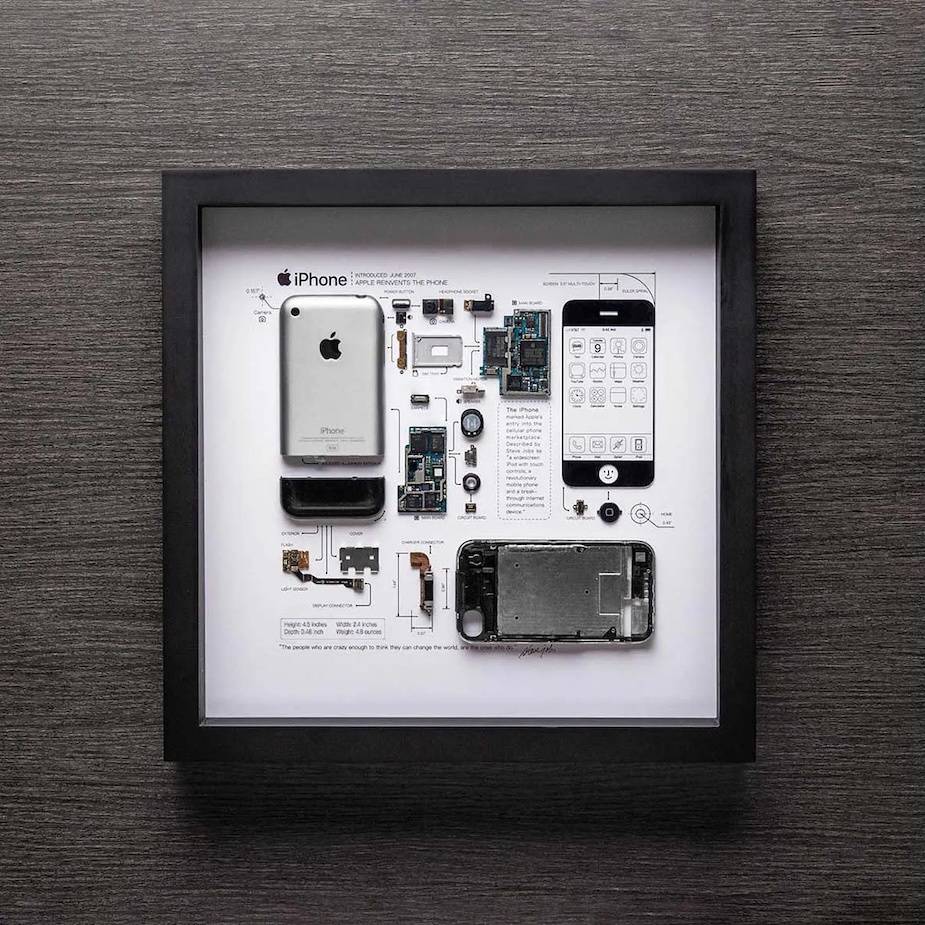 Wielu osobom produkty Apple towarzyszą przez większość życia, co z upływem czasu przekłada się na ogromny sentyment. Nie każdy przechowuje wszystkie swoja ulubione urządzenia przez lata. To właśnie dla takich osób firma Grid Studio przygotowała specjalne ramki. W jej wnętrzu umieszczono poszczególne elementy wybranego urządzenia, które zostały odpowiednio opisane. Wszystkie są oryginalne i pochodzą z rozebranych urządzeń. Wsród nich znajdziemy pomiędzy innymi płytę główną, skaner linii papilarnych, przyciski, moduł aparatu czy obudowę. Jedynie bateria ze względów bezpieczeństwa jest wysokiej jakością atrapą. Dodatkowo umieszczono krótki opis danego modelu. Każda ramka cechuje się również wybranym cytatem Steve'a Jobsa z kopią jego ręcznego podpisu. W ofercie firmy można znaleźć ramki zawierające rozłożone na drobne elementy iPhone'y, iPady czy zegarki Apple Watch. Oferta jest bardzo szeroka a cena zależy od sprzętu. W przypadku większości telefonów oscyluje ona pomiędzy 166 a 196 euro, natomiast w przypadku pierwszego iPhone'a jest to 699 euro. Jednak co jakiś czas zdarzają się duże promocje.