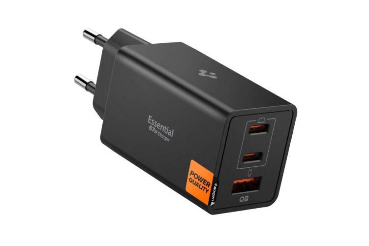 Spigen Essential EE673EU to kompaktowa i wydajna ładowarka sieciowa GaN Pro, która pozwala na jednoczesne zasilanie trzech urządzeń dzięki trzem portom: 2× USB-C (67W) oraz 1× USB-A (22,5W). To idealne rozwiązanie dla osób, które potrzebują uniwersalnego źródła zasilania dla smartfonów, tabletów, słuchawek czy innych akcesoriów w jednym, małym urządzeniu. Technologia Quantum Boost automatycznie dopasowuje moc ładowania do podłączonych urządzeń, zapewniając szybkie i optymalne ładowanie bez strat. Wbudowane funkcje Overcharge Prevention, Voltage Matching i Voltage Regulation chronią urządzenia przed przeładowaniem, niestabilnym napięciem i nadmiernym prądem, zapewniając bezpieczne i stabilne ładowanie w każdych warunkach.
