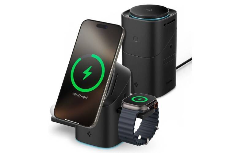 Stacja ładująca Spigen Essential EF223MS Qi2 dostępna jest w kolorze czarnym