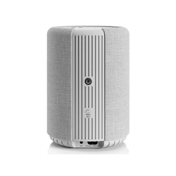 Z tyłu znalazło się gwintowane gniazdo do zawieszenia głośnika, przycisk resetowania lub aktywowania parowania z aplikacją i siecią Wi-Fi oraz – na dole – gniazdo zasilania i gniazdo AUX.