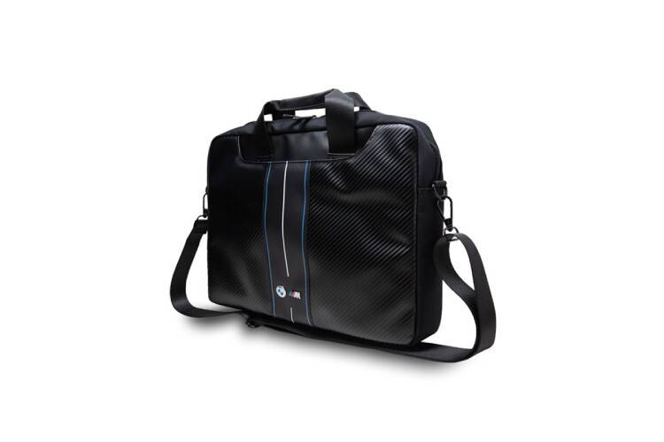 BMW Carbon Blue Stripes to torba wykonana z połączenia wysokiej jakości nylonu i skóry ekologicznej. Motyw carbonu zapewnia ekskluzywny charakter i przyciąga uwagę. Kolekcja zachwyca ulokowanymi centralnie na środku torby wąskimi pasami w kolorystyce pakietu M Performance oraz emblematami marki BMW i M Performance.